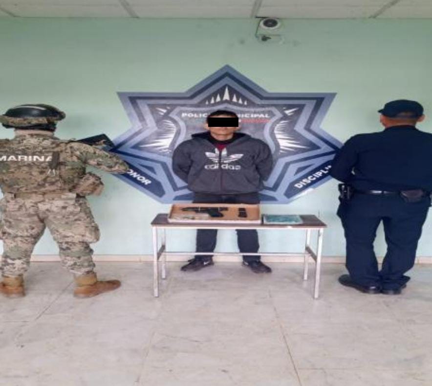 Derivado de un filtro de vigilancia agentes de la Policía Municipal detuvieron a un hombre en la colonia las Fuentes, a quien se le aseguró un arma de fuego y 100 envoltorios de una sustancia de color blanco con características similares a las del cristal.