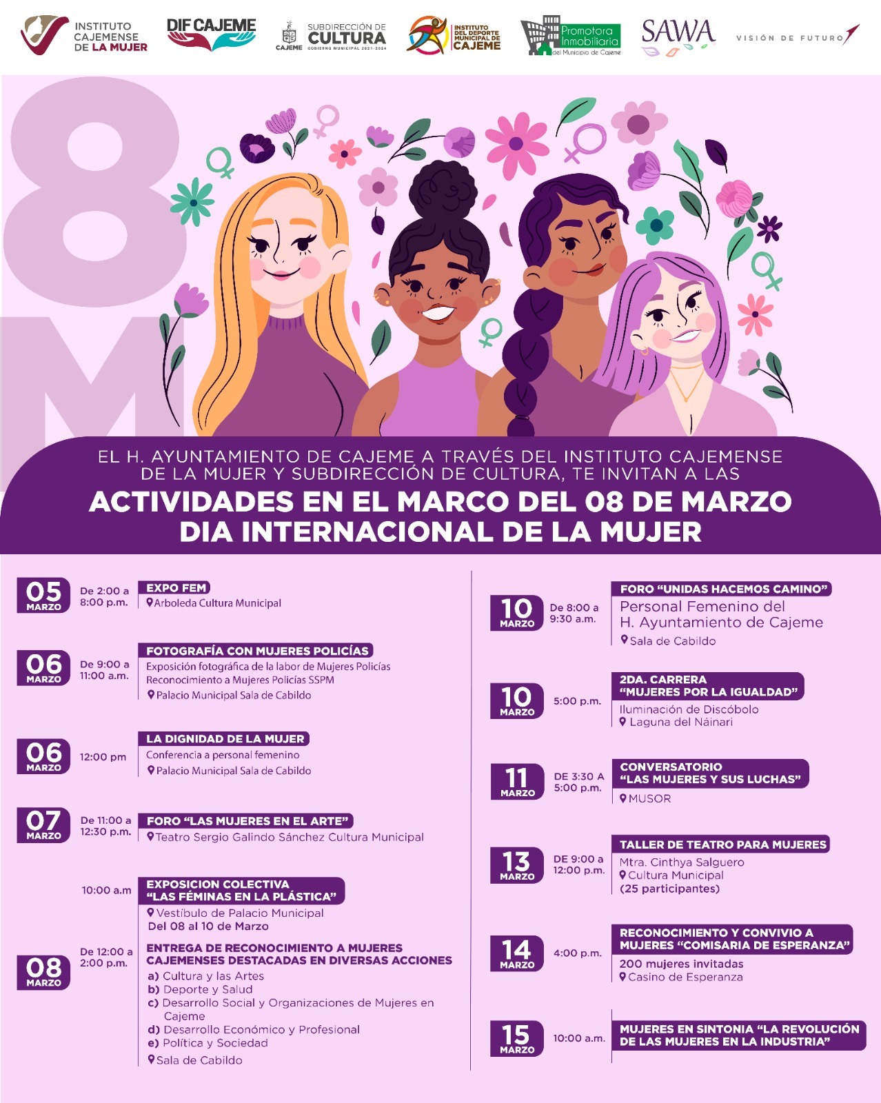 Con el objetivo de conmemorar un año más del Día Internacional de las Mujeres, el Gobierno Municipal a través del Instituto Cajemense de la Mujer (ICM), en colaboración de la Subdirección de Cultura, DIF Cajeme, Instituto Municipal del Deporte, Promotora Inmobiliaria y Sawa Fem, invita a las familias cajemenses a participar en las actividades reflexivas, culturales, políticas, deportivas y sociales que se llevarán a cabo del domingo 5 al miércoles 15 de marzo en diversas sedes de la localidad.