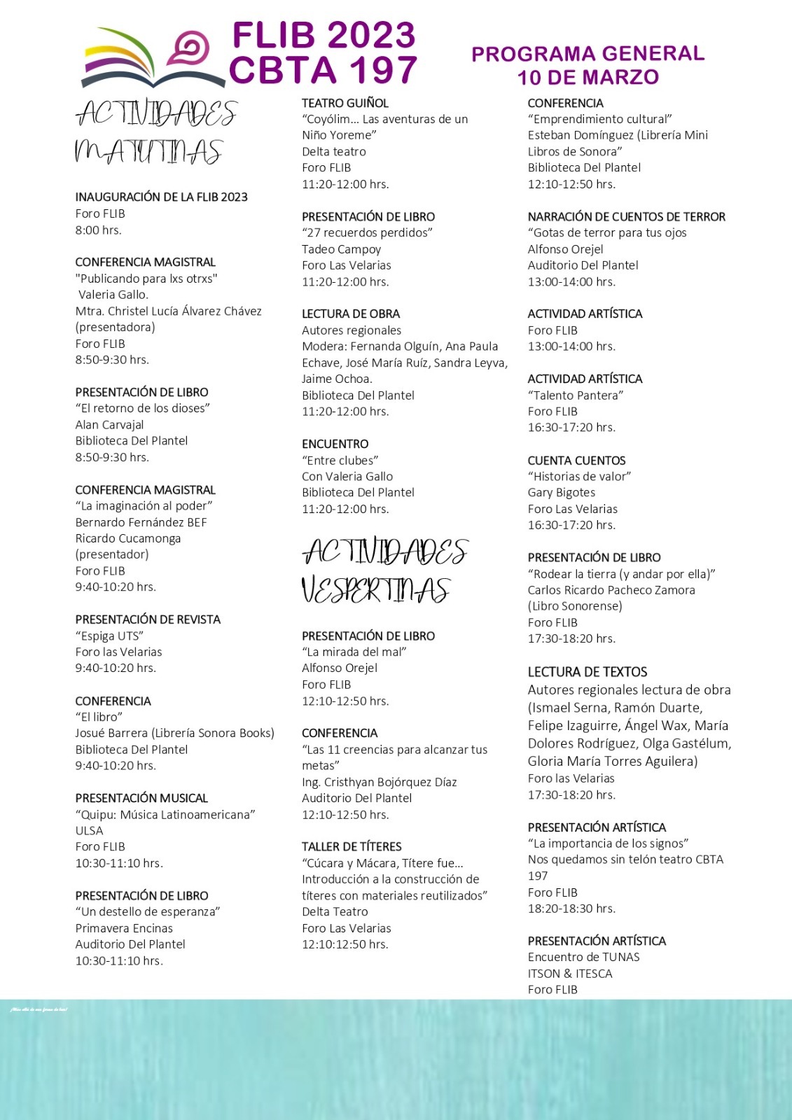 La directora del CBTA 197, Clarissa Márquez, informó que esta feria del libro estará integrada por escritores de talla nacional, quienes realizarán sus presentaciones en un horario de 8 de la mañana a 8 de la noche, con actividades como conferencias, presentaciones, teatro, lecturas y encuentros, todo esto impartido por diferentes invitados como Ricardo Cucamonga, autor de Cindy La Regia, Valeria Gallo, Alan Carvajal, Bernardo Fernández, Josué Barrera, ULSA, Primavera Encinas, Delta Teatro, Tadeo Campoy, Fernanda Olguín, Ana Paula Echave, José María Ruiz, Sandra Leyva y Jaime Ochoa.
